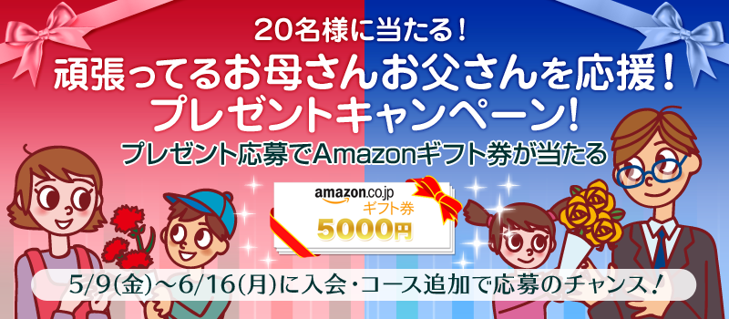 いつも頑張っているお母さん、お父さんに日頃の感謝の気持ちを込めてAmazonギフト券5,000円分をプレゼントしよう!