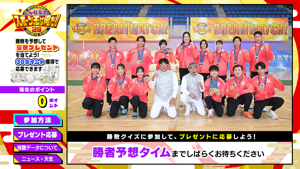 ・本規約は、株式会社テレビ朝日(以下「テレビ朝日」といいます)が、「夢対決2025 とんねるずのスポーツ王は俺だ!!」(以下「本番組」といいます)に関して実施する「データ放送プレゼント企画」(以下「本企画」といいます)でのプレゼント応募に関する事項を定めるものです。