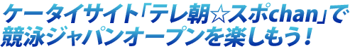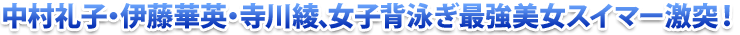 北京五輪で北島康介、柴田亜衣と同じく注目が集まる女子背泳ぎ代表。北京五輪代表枠「2」を巡って中村礼子、伊藤華英、寺川綾が激突!常に世界ランク上位に名を連ねる彼女たちだけに北京でのメダルにも期待大だ。中村は2大会連続のメダル獲得へ、伊藤は初の五輪出場へ、寺川はアテネ五輪8位のリベンジに燃えている。競泳ジャパンオープンでは最強トリオが激突!