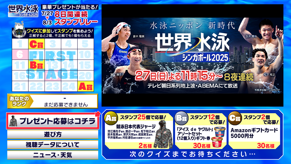 「世界水泳シンガポール2025」の放送中にクイズが出題されます。