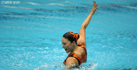続いて、念願の国際大会でのソロ初メダルを狙う日本のエース、鈴木絵美子が気合十分な表情で登場した。音楽は「トッカータとフーガ」。静かにナチュラルに入水する様は、イメージテーマである「眠りから覚めた人魚姫」を見事に想像させる。そして、さっそく世界に誇る脚技を披露し、会場は興奮に包まれる。水面に絵画を描く如く、しっとり舞いを演じると、曲はアップテンポに。ここからは脚技の連続だ。パターンが次々変わり、その中には鈴木独特の軸を傾けるスピン「絵美子スペシャル」も含み、そのレベルの高さを知るコーチ、選手らからもどよめきが起こる。最後に再びしっとりとした、しかし力強い舞いで演技を見せると、ほっとした笑みが鈴木からこぼれた。脚技だけでなく、表現力にも大きな成長が見られた。そしてジャッジの評価は、TMで6つ、AIで5つの9.7点を並べ、FRの得点48.500点。トータル96.850点で暫定2位。メダルを確定させた。