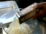 海女さんの仕事は潜るだけではありません。採ってきたテングサを真水で洗い、天日に晒します。それを何度も繰り返すと、やがて赤褐色だったテングサがアメ色にかわります。これが完成の目安。磯臭さが程よく抜け、あの透明感のある美味しいトコロテンが作れる、テングサになるのです。そして、ここからがトコロテン作りの本番、そのテングサを煮たてます。ゼリー状に固まる物質が含まれた煮汁を絞り出し、器に入れて置いておくと、常温でも固まります。お馴染の「天突き」で突けばできあがり。海藻からトコロテンへ、華麗に大変身です。