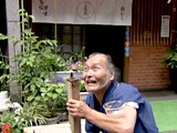 アイスクリームも冷蔵庫もない江戸時代の夏。水桶で冷やしたトコロテンは江戸っ子の大好物でした。「トコロテン屋~」という売り声と共に、行商がトコロテンを売りにくるという光景が、夏の風物詩となっていたそうです。その中でもお客さんを集めたのが、「トコロテンの曲突き」。ひじに器をのせて、空に向かって「天突き」をかまえます。トコロテンの曲突きでござい!お客さん、どうぞ見ていって下さい!