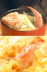 旬の毛ガニを地元ではどう食しているのか、お寿司屋さんをのぞいてみました。旬の時期にだけ味わえる毛ガニ刺しや、毛ガニのにぎり寿司、かに汁が並びます。