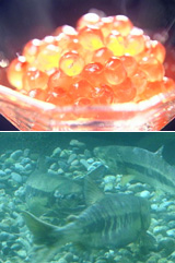 川が美しかった昔、サケは太平洋側では静岡の天竜川まで獲れました。現在でも11月になると、三陸や新潟まで下ってきます。漁は海側で刺し網や定置網で行われ、獲れるのはシロザケ。日本で一般にイクラといわれるものはシロザケの卵です。ことイクラに関しては宮城県南部、阿武隈川河口に位置する亘理町荒浜(わたりちょうあらはま)の「はらこめし」が有名です。狩りに訪れた藩主伊達政宗に漁民が献上したところ、口にして大変喜んだという言い伝えもあるこの料理、なんと生のイクラ(はらこ)を煮汁にいれてトロリ半熟に…