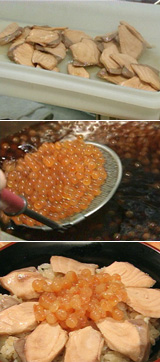 3.さらに、煮立った汁ではらこを煮て、容器にすくい上げる。