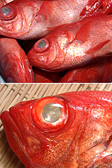 キンメダイは漢字で書くと「金目鯛」、通称キンメ。目が金色に光って見えることから、その名がつきました。普段は水深200メートルから700メートルの深海にひそんでいて、その艶やかな色と引き締まった美しい姿から、「深海の貴婦人」と呼ばれています。1年中獲れる魚ですが、旬はなんといっても冬。脂の乗る3月頃までが最も美味しい時期です。代表料理はなんといっても「煮付け」、甘辛く味付けされたキンメダイはご飯が何杯もすすむ美味しさです。