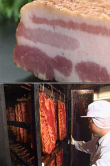 赤身と脂身のきれいな層。フライパンで焼くと、おいしそうな匂いとともにその脂身から凝縮した旨みがにじみ出ます。ベーコン(bacon)の語源は、ゲルマン人祖語の背中を意味するbakkonと古いドイツ語で豚のわき腹肉を塩漬け燻製したものをさすbahhoが古いフランス語でbaconとなったことによるといわれています。日本の新巻鮭と同じように長期間の保存を目的として生まれたもので、食肉中心の食文化を持つヨーロッパの国々では、何千年も前から塩漬けや燻煙された肉の加工品が食べられていたといいます。そんな歴史のある食材、ベーコンの美味しさを探していきましょう。