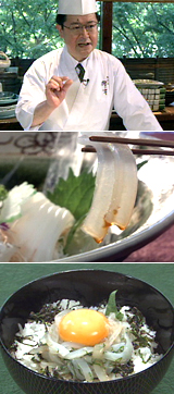 重い大きなイカをまな板にのせ、器用にさばく料理人の見事な包丁さばきは必見です!他のイカでは味わえない、肉厚でシコシコとした歯切れの良さ。モチモチした食感。ギュッとつまった深い甘みと旨みは、噛めば噛むほどにじみでてきます。ツルッとむける外皮と、内側にはりついた内皮。この薄皮を丹念にはがすと、プルプル透きとおった美しい身があらわれます。〝希少価値の高いアオリイカを余すことなく味わってほしい…〟刺身、焼き物、揚げ物、炒め物・・・。調理法は、数知れません。各地の料理人が、ユニークなアオリイカ料理を織りなします。
