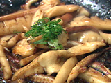 (3)フライパンに火を入れ、サラダ油とバターを焦がさないようにとかし、ゲソを手早く炒めながら、塩コショウをふる。