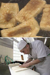 地域によって、呼び名も様々!お揚げさん、うすあげ、あぶらげ・・・。形も、関東は長方形ですが、関西、中国、四国、九州では、三角形や正方形のものもあります。中には、まるで厚揚げのような〝ジャンボ油揚げ〟もあります。カリッカリの香ばしいジャンボ油揚げ料理をお楽しみ下さい!老舗の豆腐屋さんを訪ねると、皆、夜中から仕事を始め、毎日、1枚1枚油揚げを手揚げで仕上げていました。白い生地は、一見、豆腐のようですが、豆腐とは大豆の煮方が違うのです。実は〝豆腐より、油揚げを作る方が遥かに難しい〟のだとか・・・。油で揚げた時、あくまでもしっかりのびて、膨らみ、ピンと張らなければ、良い油揚げとは言えないそうです。油揚げ1枚にも、職人たちの熱~いこだわりがありました。