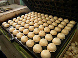 「饅頭麩=岩船麩」です。両手にあまるほどの大きな丸い形に焼き上げる鉄板は、まるで巨大な「たこ焼き器」。それにしてもなぜ丸いのか?・・・「角をとって丸く収めれば幸せだからじゃないかしら?」、昔ながらのこの不思議な形に何の疑問も持たない地元の人たち。今も3軒の店が郷土の味「岩船麩」を作り続けています。