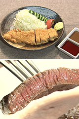 新橋にある「おか田」で味わえるのは牛かつ。驚くのはその揚げ時間。何と210度の油でわずか30秒!!無駄な脂がない赤身肉の旨味を最大限に活かす揚げ方だといいます。その技術にはご主人の技が駆使されています。