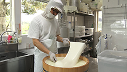 髙橋さんの相棒、チーズ職人の大倉典之さんも、勉強会に参加したり多くの専門書を紐解くなど、高橋さんの牛乳を活かしきるチーズ作りに挑戦しています。そして、ブルーチーズだけではなく、酵母を使ったフルーティーな香りのチーズや、果物の果肉を使ったチーズなど、様々な種類を作り出しています。そんな大倉さんが今挑戦しているのは、チーズを作った後大量に残る水分・ホエイから、さらに新しくチーズを作り出すこと。日本ではまだほとんど知られていない、キャラメルのようなチーズだと言います。試作した新作チーズを髙橋さんに試食してもらいますが、その反応は?