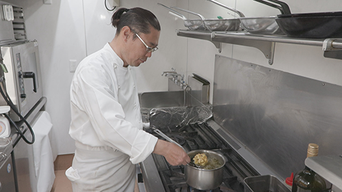 そんな吉田さんのシルクスイートの評判を聞いてやってきたのが、“メイド イン 茨城”をテーマに料理するクチーナ ノルド いばらきの佐藤協壱シェフ。収穫体験をし、焼いたシルクスイートのカレーフォンデュ風を試食して、ねっとり感や辛味と甘みのバランスに驚きます。そこからヒントを得たシェフは、さっそく新作イタリアンに挑戦。
