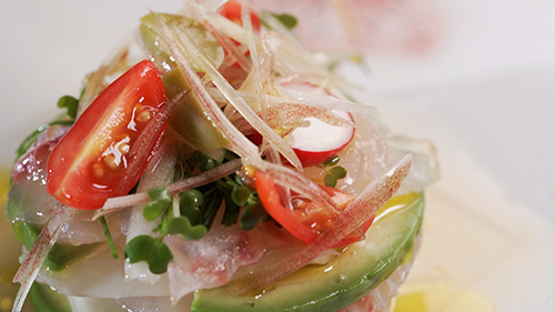 創業40年を超える懐石料理店では、昆布締めにした鯛にオリーブオイルを合わせ、その旨みを引き立てます。