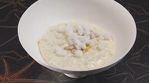 銀座の人気イタリアン「FARO」の加藤峰子シェフパティシエは、イタリアで腕を磨き世界的な受賞歴を誇る実力派。小滝米の甘さに衝撃を受け、デザートに仕立てます。