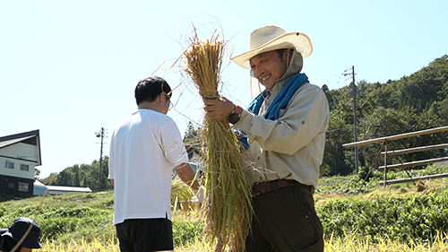 大震災を機に広がった交流の輪。小滝集落の収穫祭には、地元・松本大学の学生が米作りに感銘を受け参加し、県内の和食料理人・杉浦健夫さんも、小滝米の味わいに惚れ込み店の料理に取り入れています。