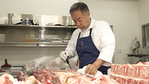 店主の新保吉伸さんは肉一筋43年。独自の手法で全国の料理人から引っ張りだこ。