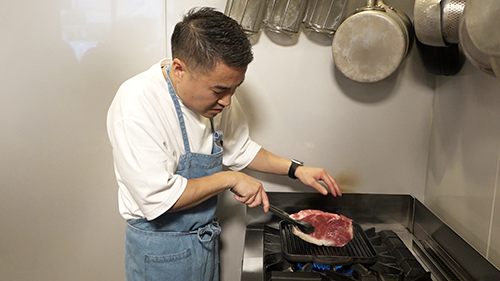 焼き加減を丁寧に見極めると、肉をトレーにあげ「肉を休ませる」松居シェフ。