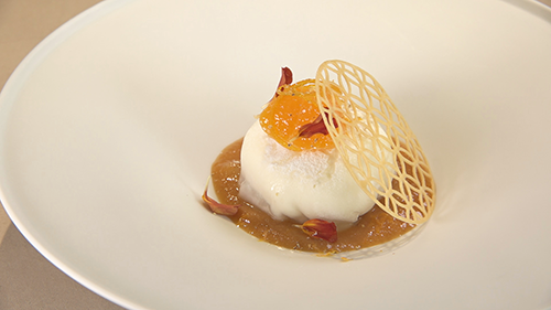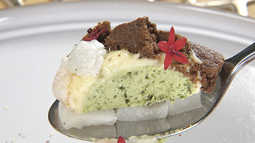 つきたての餅は小さく切り、バジルのムースと合わせ、かき餅は揚げて…どんなデザートができるのでしょうか。
