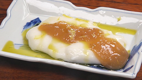 茹でた餅に、特製のゆず味噌をかけ、そこへバージンオイルをかけるという新しい発想の組み合わせ。