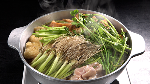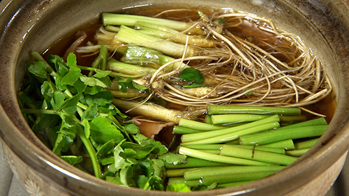 せりが主役として根まで味わい尽くされる“せり鍋”は、滋味深い味わいが身体に染み渡ります。