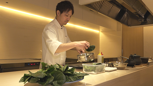 東京・神楽坂にある「懐石 小室」の小室光博さんもこの季節を心待ちにしていました。本鱒を茹でたほうれん草で巻き、ウニ、梅あんをかけた一皿は濃厚な旨みとほうれん草の風味が際立ちます。そんな小室さんが使ったのは群馬県のほうれん草です。