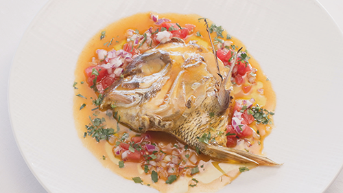 まず、兜をオリーブオイルでアロゼして、アラ出汁や魚介ソースを加え、ハーブ、トマトなどを散らした春爛漫の一品。