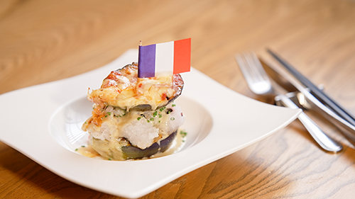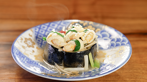 メインディッシュは、旬の野菜を詰めて焼き上げた水なすに、“関西の夏”を代表する、ある「海の幸」を合わせます。