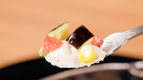 角切りにした水なすを炒め、チキンブイヨンでじっくり煮込み、生クリームと合わせて冷やし固めたムース。