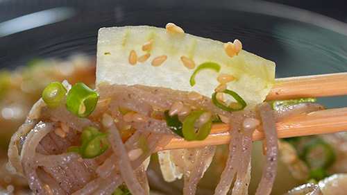 三浦市の蕎麦懐石の店では冬瓜の食感を生かした清涼感引き立つひやかけ蕎麦。