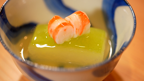 築地の日本料理店では翡翠色の実をきれいに残し、冬瓜の魅力を引き出す技を使った料理が…