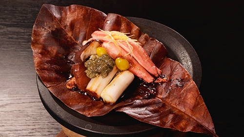 島で評判の日本料理「なかむら」では、香ばしい“カニの朴葉焼き”や口どけ滑らかな“カニと湯葉のあんかけごはん”が楽しまれています。