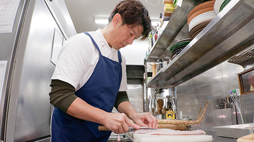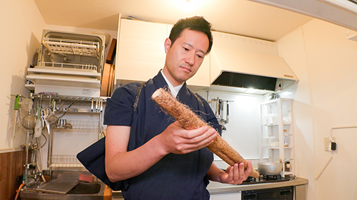 名田庄の自然薯に興味津々なのが、小浜市で人気フレンチレストランを営む三宅寿宣シェフです。
