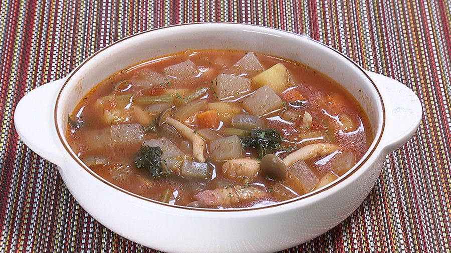 1.角切りにしたこんにゃく(商品名:湧水と蒟蒻がまるごと)を水で洗う。 2.鍋にオリーブオイルをひき、刻んだニンニク、セロリの茎、たまねぎ、にんじん、ベーコン、小松菜の茎を炒める。 3.じゃがいもを加え、さらに炒める。 4.カットトマトのトマト缶、水を加える。 5.1のこんにゃくを、水を切って加える。 6.固形スープストック(ブイヨン)、しめじ、小松菜の葉、セロリの葉を加える。 塩、コショウ、パセリで味を整えたら完成