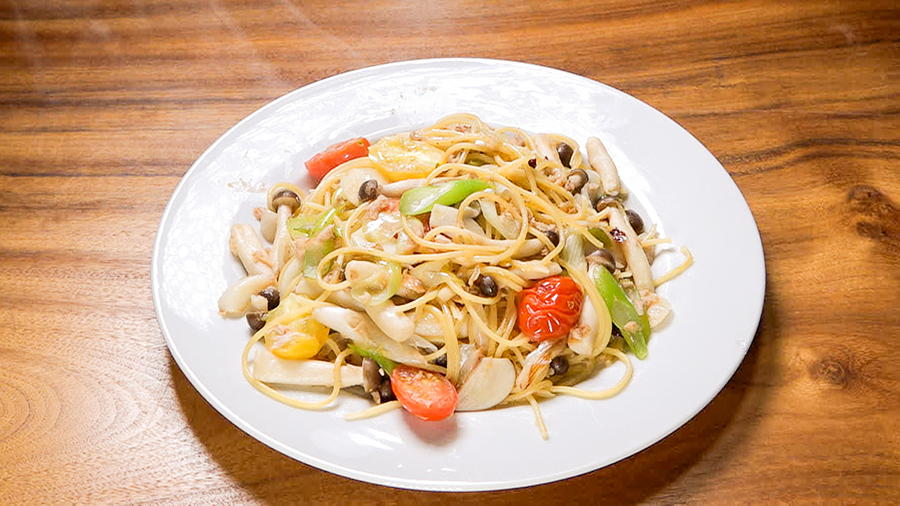1.フライパンにオリーブオイル、にんにく、鷹の爪を入れ、火にかける。 2.香りが立ったらツナ、好みの野菜(しめじ、ねぎ、ミニトマトなど)を加え、油が馴染むくらいに炒める。 3.茹でたパスタを加え、炒め合わせる。 4.「しょっつる」を加える(1人前につき小さじ1杯程度)。全体に絡まるように混ぜ合わせたら完成。 ※しょっつるにはハタハタの旨みが凝縮されているため、塩・胡椒など味付けの必要なし!