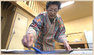 伊勢型紙による型染めの伝統技法を受け継ぐ職人で、今年度“現代の名工”として表彰された三橋京子さん。江戸期から続く型小紋の工房6代目の三橋さんは、生地に型紙をずらしながらのり置きし、連続模様をつけていきます。そしてその頼りとなるのが、型紙に空いた小さな送り星。しかし送り星を頼りにしても、生地には多少の曲りがあるため、いまだに勉強と語ります。また様々な型紙で型付けを繰り返す、切りばめの型小紋も制作しています。