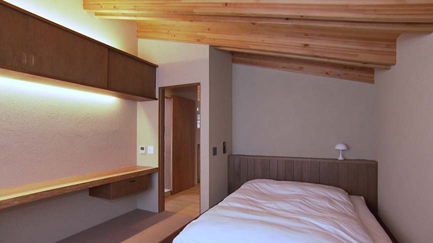 2階東端にある寝室。建主は日の出と共に目覚め、日が落ちれば休むという生活を行なっているため、朝日が入るこの位置に寝室を設けました。