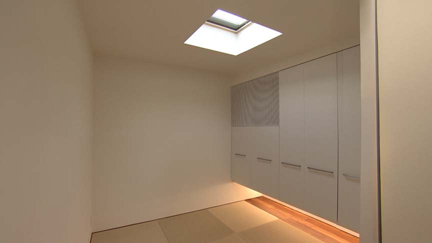 ストレッチや瞑想などを行うために設けた和室は、外周に窓が無く天窓のみ。客間としての使用も考慮して、布団が収まるサイズの収納を備えています。