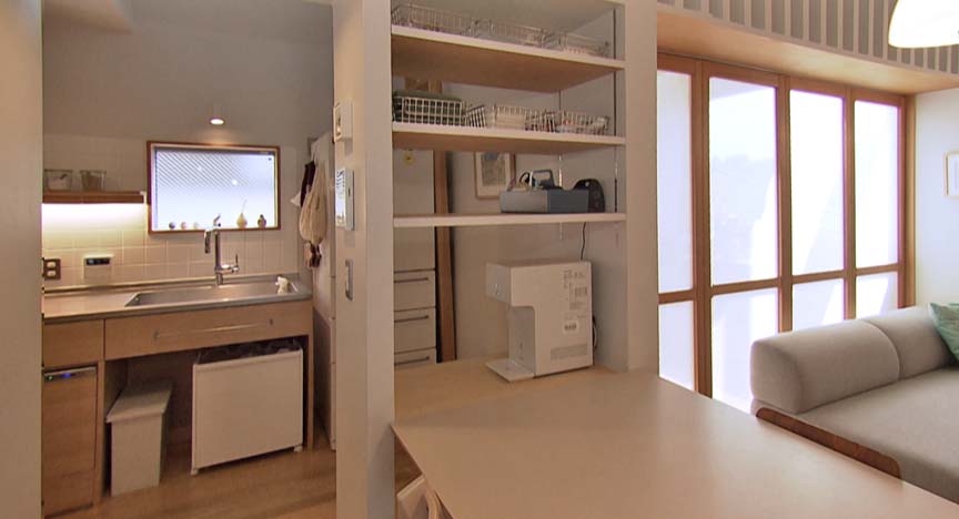 画像左手は台所。調理に集中できるクローズド型です。右手はサンルーム。間仕切りは折れ戸で全開すれば居間と一体に。折れ戸に張っているのはロールスクリーン用の布です。