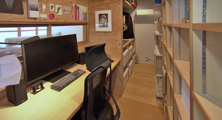 居間から床を30cm下げた書斎。籠もり感がありつつ、家族とのつながりも感じられる空間です。奥に収納が隣接しています。