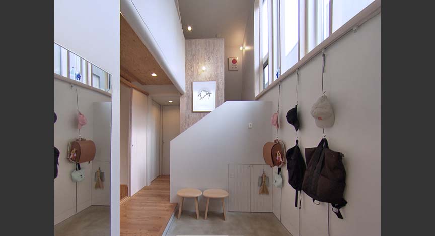 いくつか候補を見た後に購入を決めた土地は、周囲に異なる高低差のある旗竿地でした。南隣地は高く、西隣地は低いという特徴があり、この高低差を克服するために基礎を高くすることで、日差しと眺望の両方を獲得しました。高基礎の上の1階に寝室、子供室と水廻りを配置し、子供室の床だけ基礎の高さだけ下がっています。子供室の床が下がることで隣接する玄関ホールに広がりが生まれます。吹抜けのある玄関ホールの横に階段を配置し、上方向に伸びやかなつながりを持たせました。2階には家族が集うLDKを配置。東の吹抜けに設けた連続窓と西側に設けた高窓、サンルームを通して一日の太陽の動きを感じながら光が移動します。南側に大きな窓がないものの、窓の配置を工夫することで穏やかな光の状態に整えることを考えています。東の連続窓に設けた縦桟の効果で外からの視線が気にならず、西側の窓は縦格子や布を貼った建具を通して間接的に光を届けます。光の状態を整えることで家族が寛ぐのに相応しい室内環境をつくりだそうとしています。
