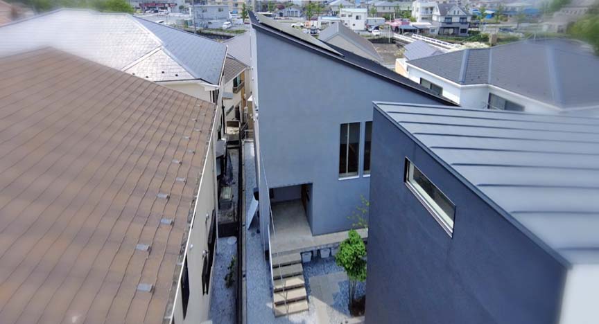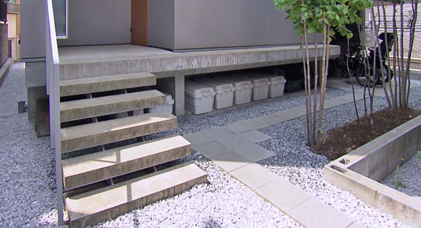 旗竿形+北斜面+内部に高低差のある複雑な敷地。そこで基礎を1.2m立ち上げ、家全体が背伸びするような形に。高くなった基礎部分は、物置としても活用しています。