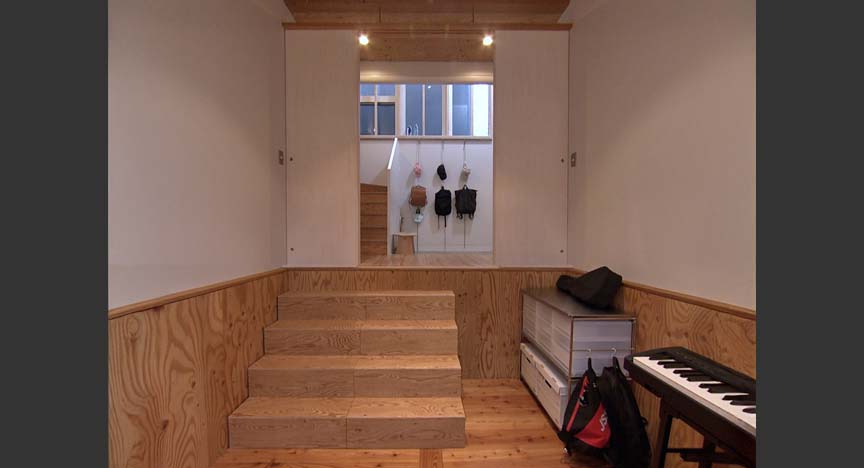 唯一、高基礎の上に載っていない子供室は廊下から1m下がっています。将来ロフトベッドなどを造作する余地を設けると同時に、玄関ホールの広がりを生む効果もあります。