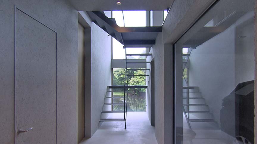 一方、建築に係る敷地条件としては、別荘地独自の規約により建物の高さが6m に制限されており、また東南方向へと下る崖地盤から影響を受けない範囲として、基礎に特別な対策なしで建築できる場所が限られていました。さらに、崖下から吹き上げる強風への配慮も必要とされました。それらの制約を逆手に、建物は8m×8m×H6mの軒の無いシンプルな立方体とし、その中で享受したい眺め(床の高さ)とのびやかさ(天井高さ)を、空間ごとにスキップフロアで構成し、メリハリをつけました。
