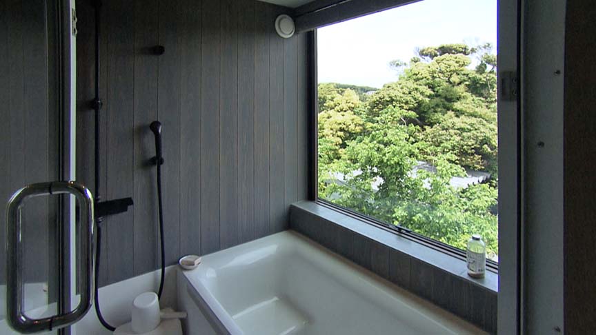 浴室はハーフユニットバスを採用。壁の一部は外壁と同じく杉板を張っています。東面には大きな窓があり、ここからも眺望を楽しめます。