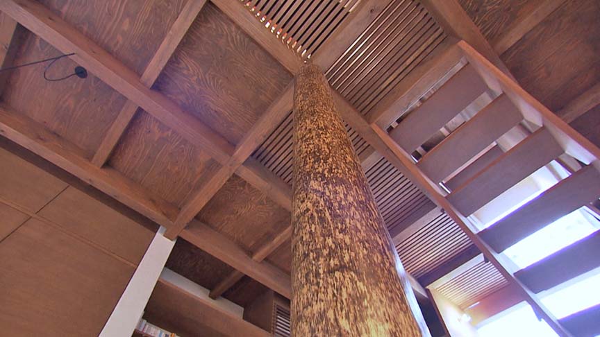 大黒柱に使用しているのは吉野桧の錆丸太。切り倒した丸太の皮をむき、地面に触れないよう切り株に載せて放置することでカビを付着させ、マダラ模様にしたものです。