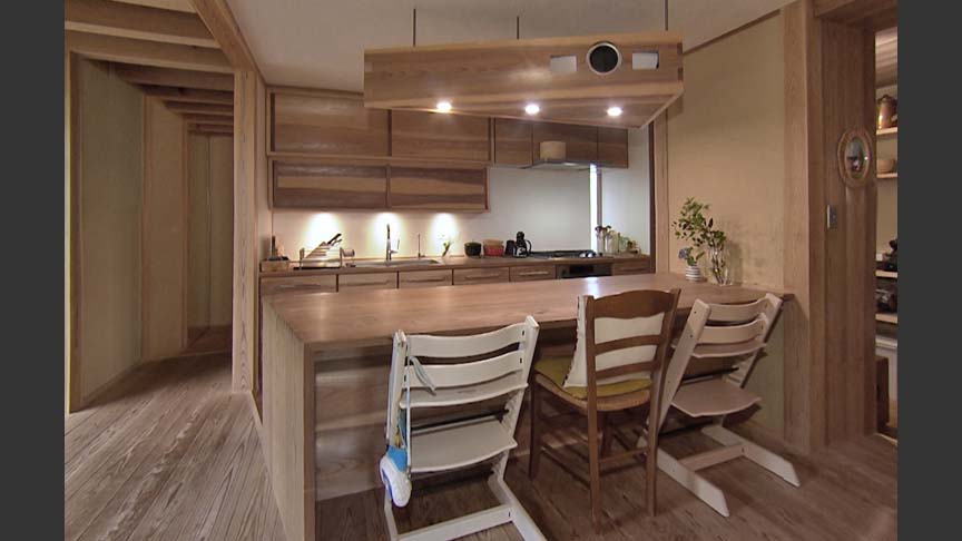 壁付けの台所、造作の食卓、いずれも全て木で仕上げています。食卓の上に吊った箱は内部にプロジェクターを納めていて、居間の漆喰壁に直接投影します。