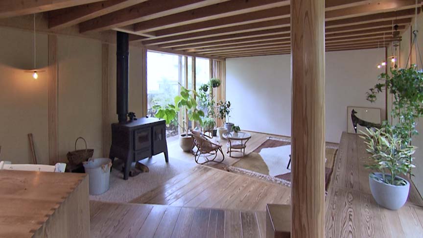 構造は仕口や継手、壁は下地に竹小舞を編んだ土壁という伝統的な工法を採用。木材は丸太で購入したものを製材して、床板や収納など様々な所に使用しています。